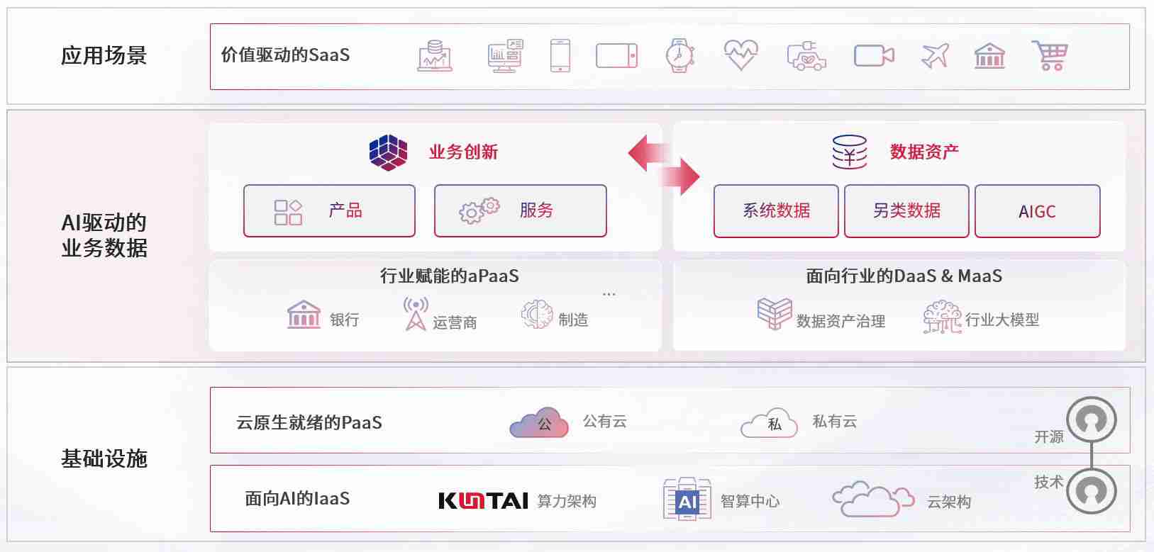 数字时代,,,,围绕企业数字化转型的关键要素,,尊龙凯时数码开创性的提出数云融合战略和技术体系框架,,,,着力在云原生、、、数字原生、、、、AI原生和信创产业上架构产品和服务能力,,,为处在不同数字化转型阶段的快消零售、、、汽车、、金融、、、、医疗、、政企、、、教育、、、运营商等行业客户提供泛在的敏捷IT能力和融合的数据驱动能力,,,,构建跨界融合创新的数字业务场景和新业务模式,,,,助力企业级客户建立面向未来的核心能力和竞争优势,,,全面推动社会的数字化、、、智能化转型升级。。